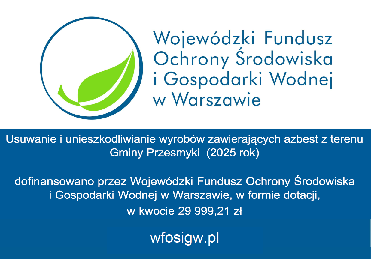16 lipca 2025 roku Pan Wójt Marek Zalewski i Skarbnik Gminy Pani Agnieszka Przestrzelska podpisali umowę o dofinansowanie z Wojewódzkim Funduszem Ochrony Środowiska i Gospodarki Wodnej w Warszawie, reprezentowanym przez Prezesa Zarządu Pana Zbigniewa Deptułę, na realizację zadania pn. „Usuwanie i unieszkodliwianie wyrobów zawierających azbest z terenu Gminy Przesmyki (2025 rok)”. W ramach przedsięwzięcia usuniemy i zutylizujemy 46,36 Mg wyrobów zawierających azbest, pochodzących od mieszkańców Gminy Przesmyki, na co otrzymaliśmy dofinasowanie w kwocie 29.991,21 zł.