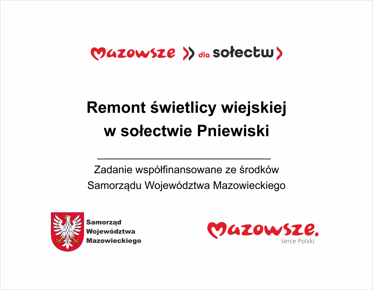 Dzięki dobrej współpracy Pana Wójta Marka Zalewskiego z Urzędem Marszałkowskim Województwa Mazowieckiego, Gmina Przesmyki zrealizowała zadanie pn. „Remont świetlicy wiejskiej w sołectwie Pniewiski”. W ramach przedmiotowego zadania wykonano remont posadzki i pomieszczeń w świetlicy. Na ten cel pozyskaliśmy środki w wysokości 15 000 zł w ramach „Mazowieckiego Instrumentu Aktywizacji Sołectw MAZOWSZE 2025” – „Mazowsze dla sołectw 2025”, taką samą kwotę wydatkowaliśmy również ze środków własnych gminy.