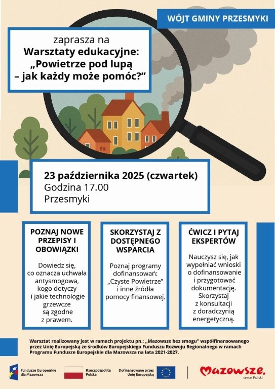 Wójt Gminy Przesmyki serdecznie zaprasza wszystkich mieszkańców na warsztaty edukacyjne pod hasłem „Powietrze pod lupą – jak każdy może pomóc?”, które odbędą się 23 października 2025 roku (czwartek) o godz. 17.00 w Przesmykach.