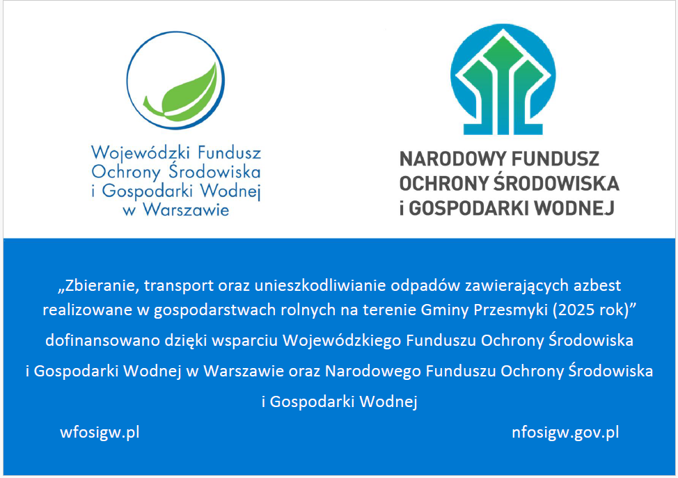 Gmina Przesmyki realizuje zadanie pn. „Zbieranie, transport oraz unieszkodliwianie odpadów zawierających azbest realizowane w gospodarstwach rolnych na terenie Gminy Przesmyki (2025 rok)” dofinansowane dzięki wsparciu Wojewódzkiego Funduszu Ochrony Środowiska i Gospodarki Wodnej w Warszawie oraz Narodowego Funduszu Ochrony Środowiska i Gospodarki Wodnej, na podstawie umowy zawartej 17.09.2025 roku.  W ramach przedsięwzięcia usuniemy i zutylizujemy 80,15 Mg wyrobów zawierających azbest, pochodzących z gospodarstw rolnych z Gminy Przesmyki, na co otrzymaliśmy dofinasowanie w kwocie 47.609,10 zł. To już kolejna akcja odbioru azbestu na terenie gminy w tym roku. Dzięki sprawnemu działaniu Pana Wójta Marka Zalewskiego i pracowników urzędu, zmniejszy się ilość tego szkodliwego wyrobu na naszym terenie.