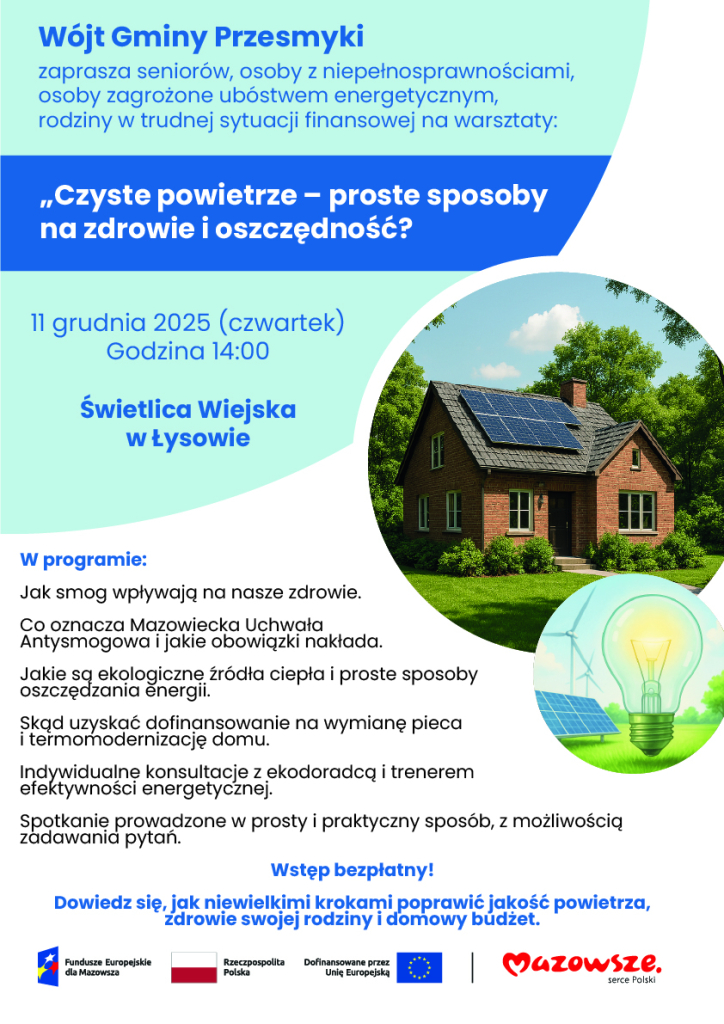 11 grudnia 2025 roku o godz. 14:00 w Świetlicy Wiejskiej w Łysowie odbędą się wyjątkowe warsztaty pod hasłem „Czyste powietrze – proste sposoby na zdrowie i oszczędność”. Spotkanie skierowane jest przede wszystkim do seniorów, osób z niepełnosprawnościami, rodzin w trudnej sytuacji finansowej oraz osób zagrożonych ubóstwem energetycznym.