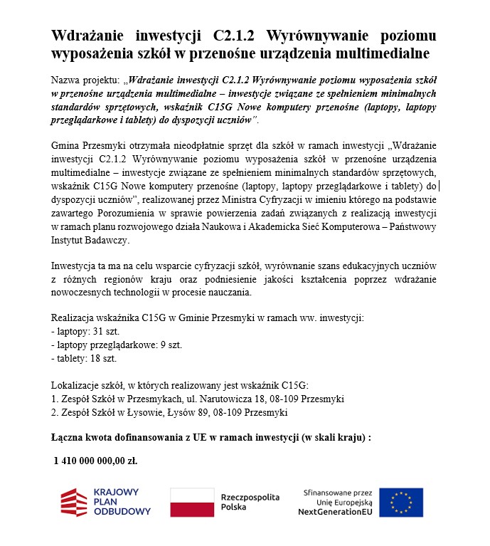Wdrażanie inwestycji C2.1.2 Wyrównywanie poziomu wyposażenia szkół w przenośne urządzenia multimedialne